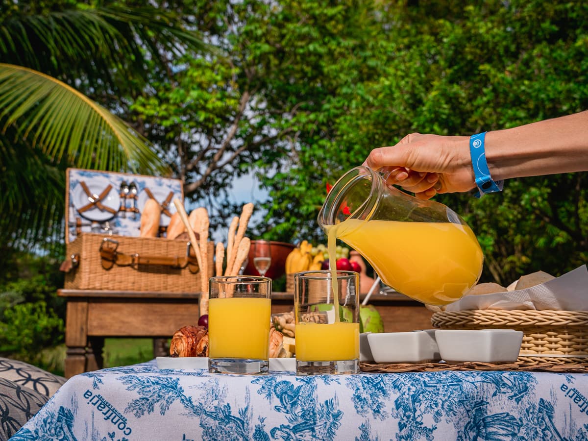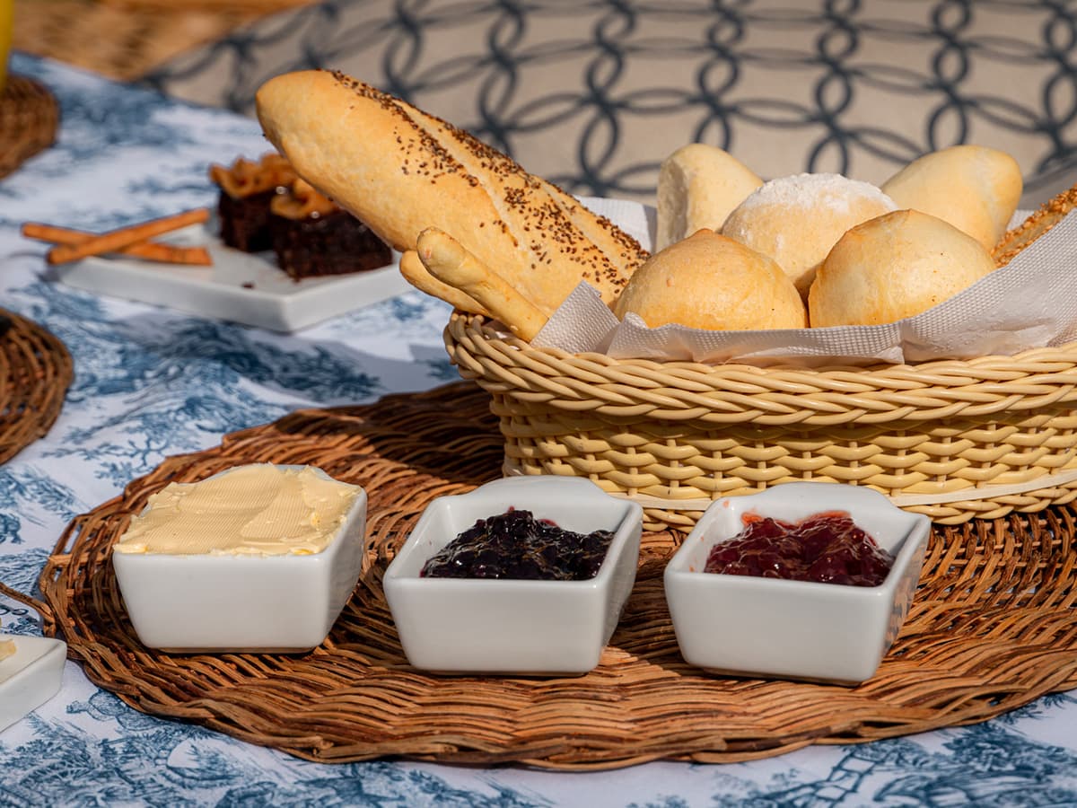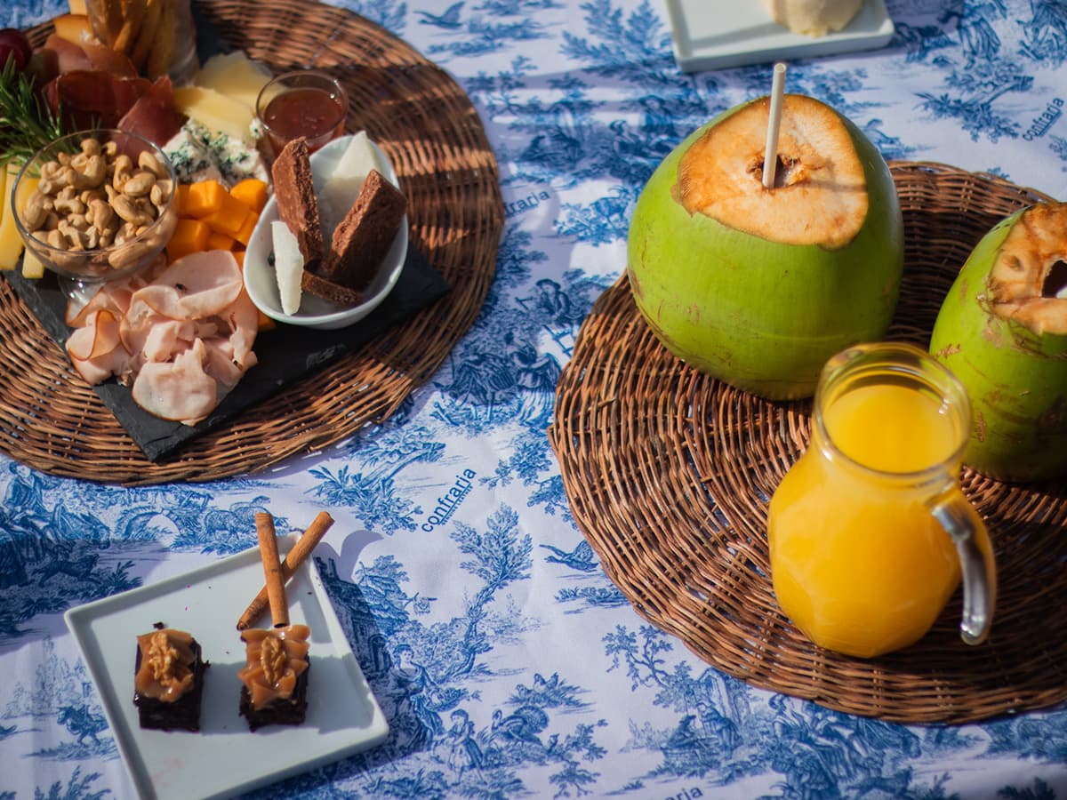 Você terá momentos especiais com um menu repleto de opções deliciosas, como:Cesta de frutas, pães artesanais, geleias de frutas, croissants, mini bolo de mandioca ou coco, brownies, tábua de frios, garrafa de vinho ou espumante (rótulos da casa), água mineral filtrada, suco e água de coco.